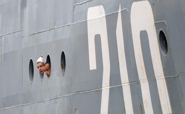 Des marins russes arrivent à bord du navire Smolniy, à Saint-Nazaire, le 30 juin 2014. JEAN-SEBASTIEN EVRARD / AFP