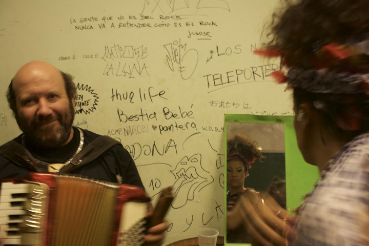 Alejandro Franov et Mariana Yegros en concert improvisé dans les loges avant de monter sur la scène du Centre Culturel Matienzo, le vendredi 22 janvier à Buenos Aires. Crédits : Justine Perez / Opinion Internationale.