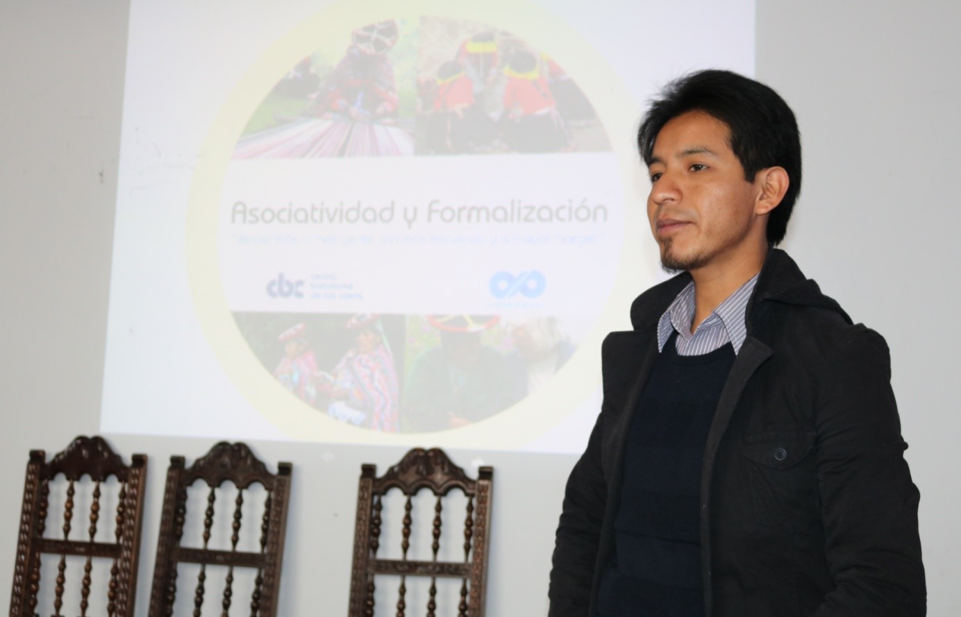 Pabel Aimituma Colque dans l’atelier qu’il donne à des artisanes souhaitant s’associer à Cusco (locaux du centre Bartolomé de las Casas). Crédit photo : Corinne Duquesne