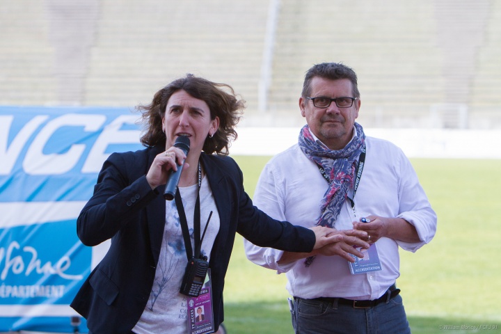 Marinette Pichon remerciant l’un des collaborateurs du FCF Juvisy début mai 2016 lors de la dernière rencontre à domicile du club. Crédit Photo : William Morice