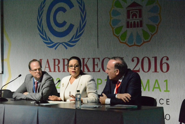 Paul Simons, Deputy Executive Director de l’IEA (Agence Internationale de l’Energie), Miriem Bensalah-Chaqroun, présidente de la CGEM (Confédération Générale des Entreprises du Maroc et Pierre Gattaz, président du MEDEF étaient réunis autour de la question du solaire à la COP22. Crédit photo : Stéphanie Petit