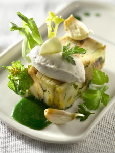 La recette : Pressé de pommes sarladaises, jus de persil et crème d’ail