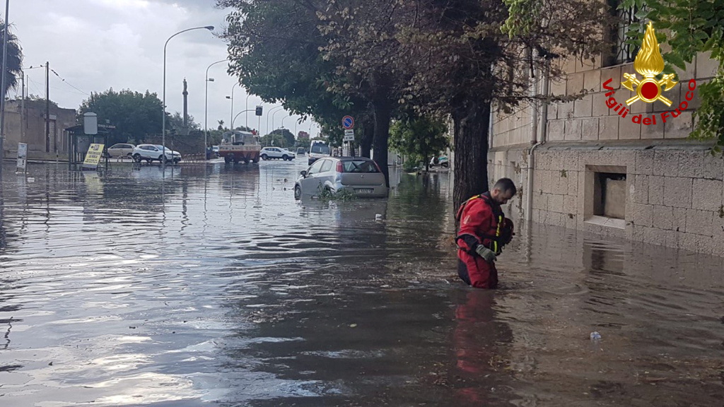 Un pompier italien vient en aide aux habitants dans un village inondé de la région de Palerme en Italie. July 18, 2021.