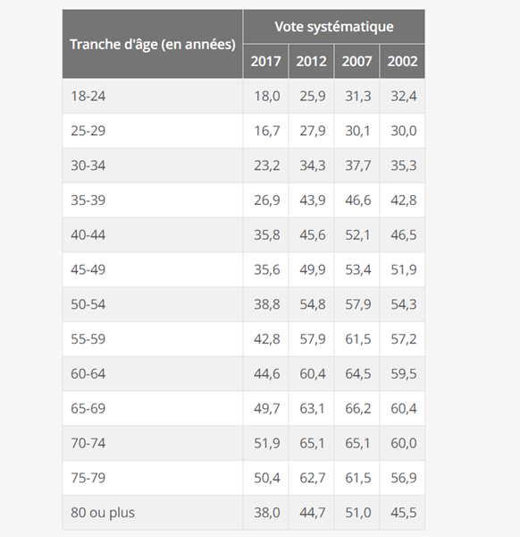 La participation électorale aux présidentielles selon l’âge. Source : Insee, la participation électorale en 2017.