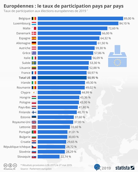 Le taux de participation par pays aux européennes de 2019. Source : Parlement européen. Crédit : Statista