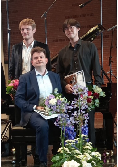 Les trois finalistes : au centre, assis, le pianiste Ukrainien Roman Lopatynskyi (lauréat et premier prix de ce concours). Derrière, à gauche et debout, le pianiste Russe Sergey Belyavsky. A droite, debout, le pianiste Sud-Coréen Geonhee Lee.