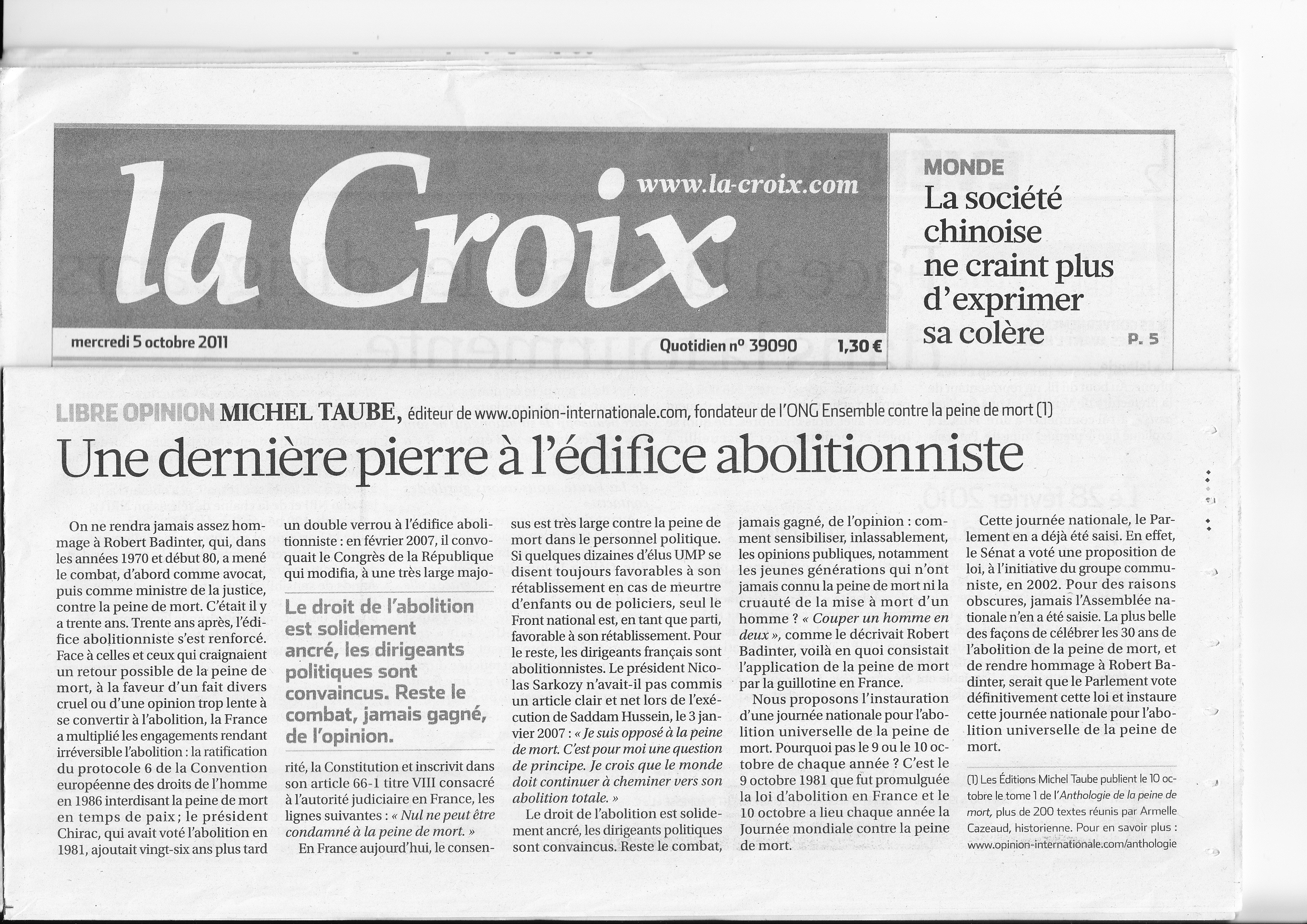 Les Editions Michel Taube publient le 10 octobre le tome 1 de l’Anthologie de la peine de mort, plus de 200 textes réunis par Armelle Cazeaud, historienne. Pour en savoir plus : www.opinion-internationale.com/anthologie