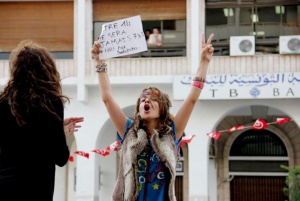 Marches Aatakni / «libère-moi », pour la liberté d’expression organisées dans toute la Tunisie après les attaques consécutives à la projection de Persépolis. Une contre-manifestation a été organisée en même temps pour dénoncer la laïcité et réaffirmer l’identité arabo-musulmane. Une jeune femme s’est hissée au-dessus des manifestants.
