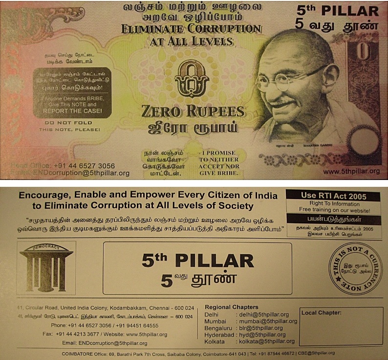 « L’idée derrière la campagne du billet de zéro roupies, explique Vijay Anand, est de donner un moyens au gens de refuser la corruption ». 5th Pillar a imprimé puis distribué plus de deux millions d’exemplaires de ce billet factice dans ce but. À chaque fois qu’on leur demande un pot-de-vin, les gens peuvent le donner pour signifier leur refus de coopérer. Au verso se trouvent une brève description et les coordonnées de 5th Pillar. Il s’agit de donner honte et de faire réfléchir ceux qui demandent des pot-de-vins. « L’effet du billet est quasi magique, raconte Vijay Anand, immédiatement les gens qui le donnent sont bien plus respectés par leur interlocuteur. »