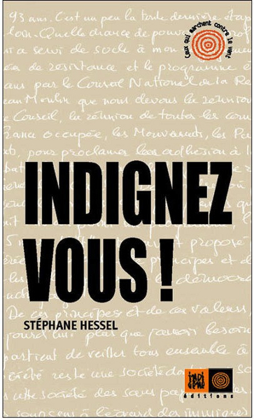 parce que j’ai constat é que le désenchantement à l’égard de la politique est plus profond en France qu’ailleurs. » Selon lui, ce désenchantement se manifeste par une indifférence et un découragement plus marqués. « Les gens ne s’indignaient pas, poursuit-il, ou seulement superficiellement et brièvement. Le désir de voir les choses changer semblait avoir moins de prise en France que chez ses voisins. » Le but d’Indignez-vous ! a donc été de ressusciter l’idée d’un changement possible, autour de deux nécessités impérieuses : la lutte contre des inégalités sociales toujours plus fortes, et la sauvegarde de l’environnement. « S’indigner ne suffit pas, prévient Stéphane Hessel, il faut s’engager, redonner de l’espoir. ».
