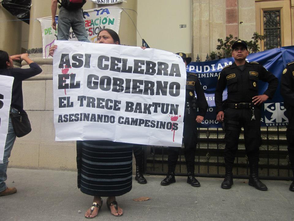 Cependant le gouvernement guatémaltèque, et le président Otto Perez Molina, n’ont pas su saisir cette occasion de protéger et d’exalter cette culture millénaire, ainsi que de promouvoir l’unité nationale. Les faits récents montrent à nouveau le mépris du gouvernement pour cette frange de la population, qui reste la plus pauvre et la plus marginalisée du pays. Le président fait la promotion du 13 Baktun à l’ONU ainsi qu’à l’OEA et organise quantité d’évènements (spectacles, danses, cérémonies), tandis que l’armée opère une répression meurtrière, réduisant à néant les efforts de communication du gouvernement.