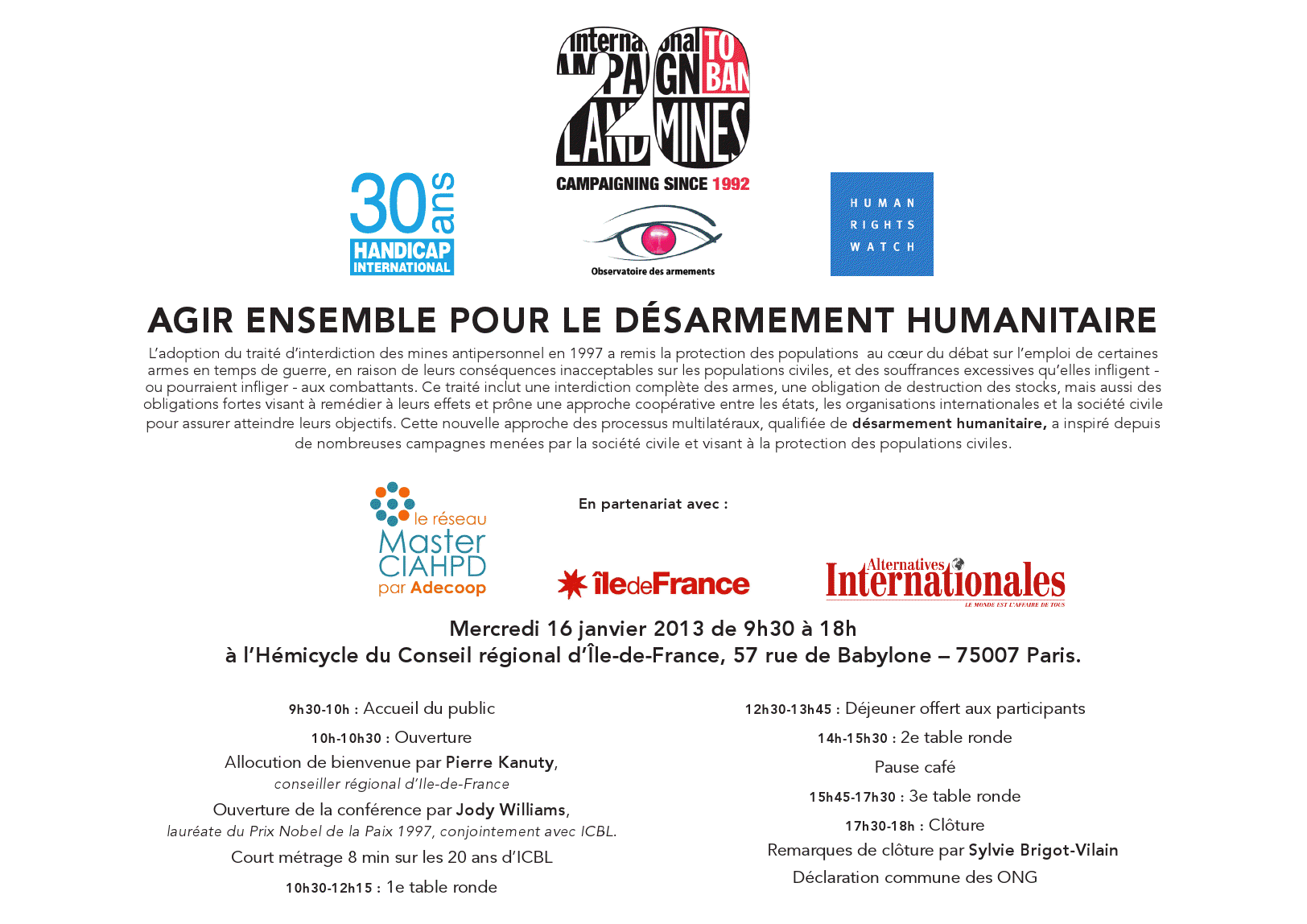 De nombreux intervenants seront réunis autour de trois tables rondes abordant différents aspects relatifs au désarmement humanitaire : faire le bilan des campagnes de désarmement, innover sur les approches de la diplomatie multilatérale et analyser le rôle de la France dans ces politiques diplomatiques. Ouvert par Jody Williams, prix Nobel de la paix en 1997, pour son travail sur la Campagne internationale pour l’interdiction des mines antipersonnel terrestres, le colloque sera clôturé par une déclaration conjointe des ONG.