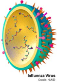 schéma d’un virus influenza : les cônes orange et rouge à la surface représentent les