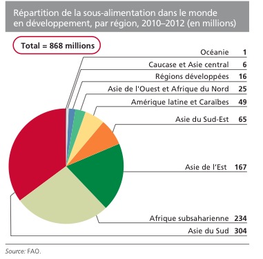 En 2012, selon l’Organisation des Nations Unies pour l’Alimentation et l’Agriculture (FAO), une personne sur huit a souffert de la faim, soit 868 millions d’êtres humains (parmi ces affamés, 852 millions vivent dans les pays en développement). Si l’on considère tout ceux qui n’ont pas reçu les nutriments essentiels à la santé, ce sont 1,5 milliard de personnes qui souffrent de malnutrition. A l’heure actuelle, 40% de la surface de la Terre est exploité par l’agriculture. Selon l‘ONG Oxfam cette surface devrait suffire à nourrir 12 milliards de personnes. Alors, comment expliquer autant de mal-nourris ?