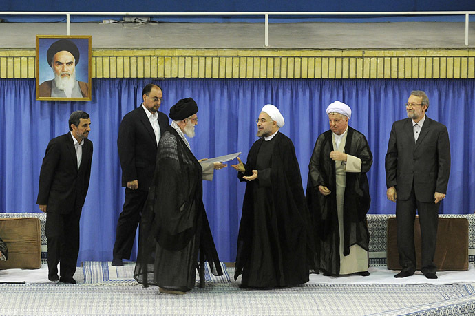 Le Guide Suprême Ali Khamenei (au centre) entreprend la passation de pouvoir entre le Président sortant Mahmoud Ahmadinejad (à gauche) et le nouveau Président Hassan Rohani (troisième en partant de la droite), lors d’une cérémonie samedi 3 août à Teheran, la capitale iranienne.