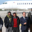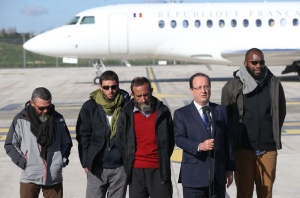 Les quatre otages d’Arlit, Marc Feret, Pierre Legrand, Daniel Larribe, Thierry Dol (de gauche à droite), le 30 octobre 2013 avec François Hollande à leur descente d’avion à l’aéroport de Villacoublay