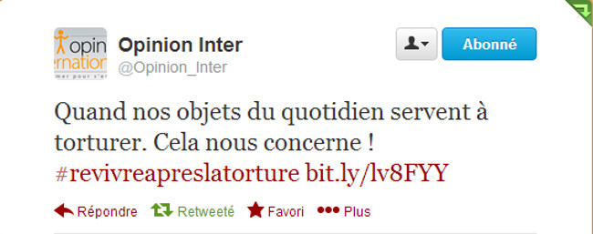 - Découvrez l’opération « épongeons la torture » : mercredi 13 novembre, le fondateur d’Opinion Internationale, Michel Taube, et le président du Centre Primo Levi, Michel Brugière, ont remis à des députés de l’Assemblée Nationale française des éponges, symbole de la torture utilisée dans certains pays. Cette éponge est inspirée de la campagne conçue par l’agence Grey Paris pour le Centre Primo Levi.