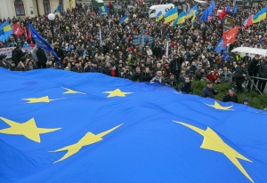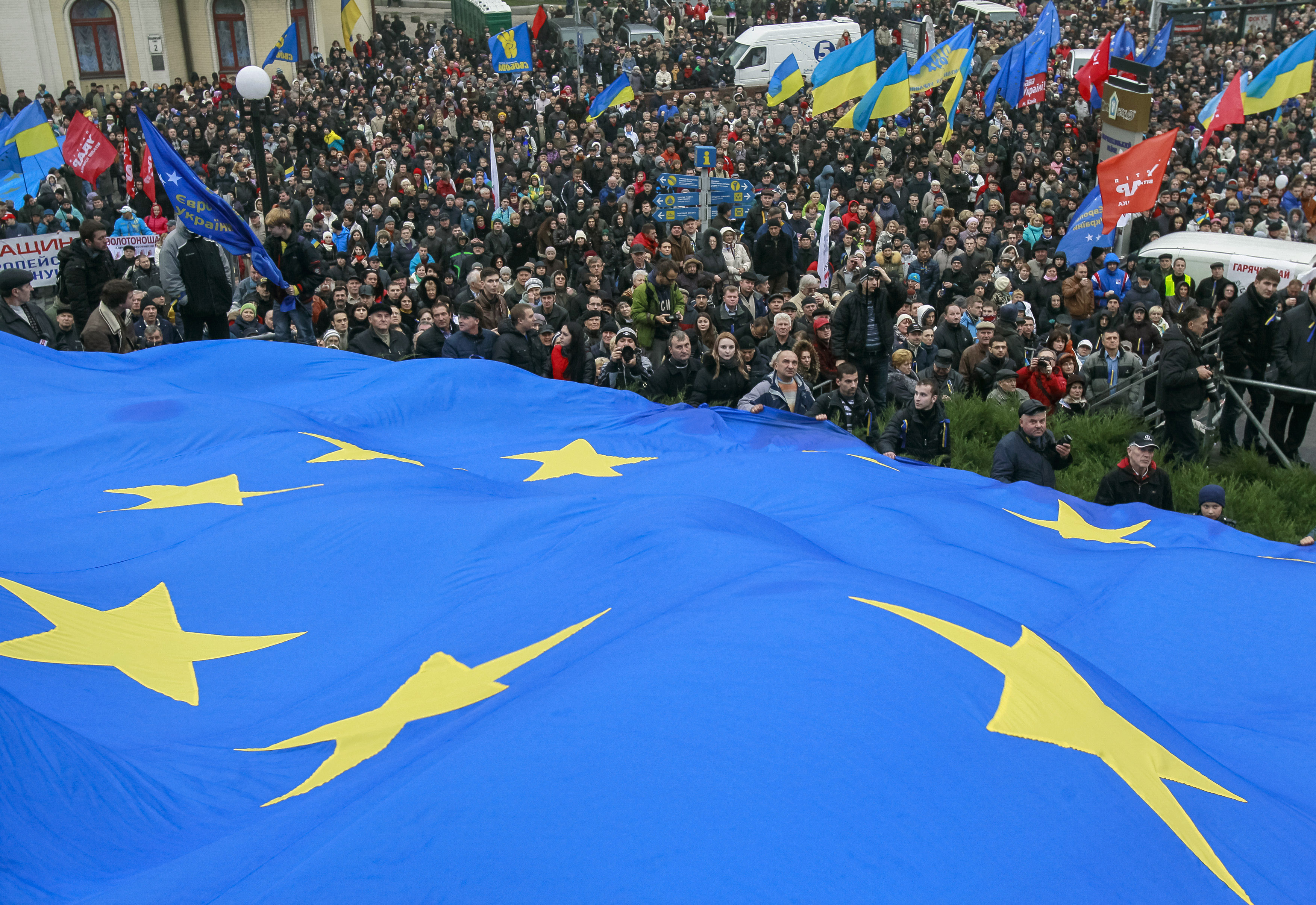 Protesters hold a EU flag as they take part in a rally to support EU integration in central Kiev