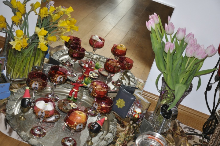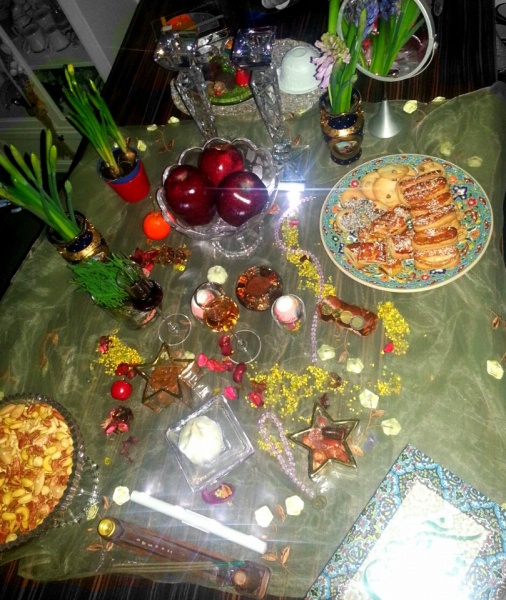 Selon la tradition pour Norouz, la nouvelle année qui commence à l’équinoxe du printemps (entre le 20 et 22 mars) on dresse une table – le Haft Sîn ( les sept S) – qui comporte sept éléments dont le nom commence par S et qui ont chacun une valeur symbolique propre.