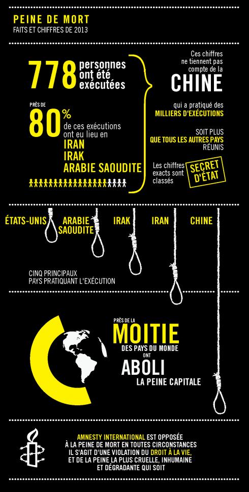 D’après ce rapport, pas moins de 778 personnes ont été exécutées en 2013, dans vingt-deux pays. Sans compter les exécutions qui ont eu lieu en Chine, car le pays garde ce chiffre secret d’Etat. N’ayant pu vérifier les dires de chacun, l’ONG a décidé de faire pression sur le gouvernement chinois pour plus de transparence, avant d’y prôner l’abolition de la peine de mort.