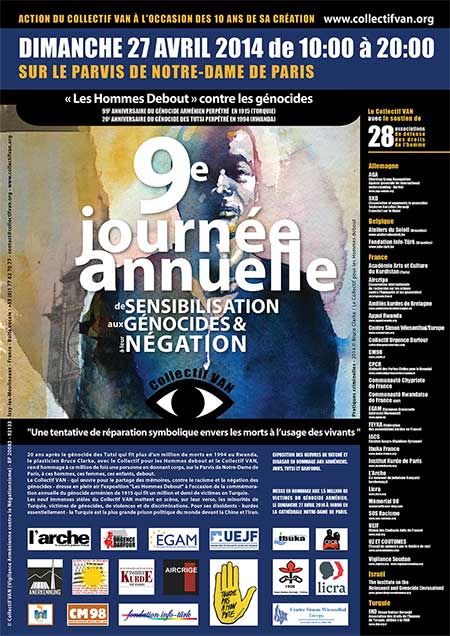 Le Collectif VAN (Vigilance Arménienne contre le Négationnisme) franchit le cap de ses dix années d’existence et organise – à l’occasion du 99e anniversaire du génocide arménien de 1915 et du 20e anniversaire du génocide des Tutsi – sa 9e Journée annuelle de sensibilisation aux génocides et à leur négation.