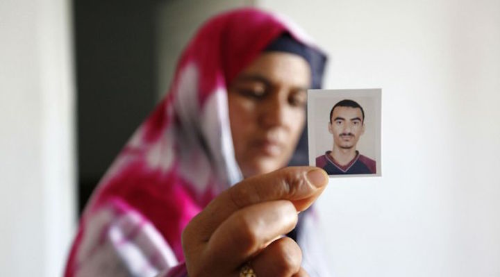 Une habitante de Ben Guerdane montre une photo de son fils aîné, fin avril. Elle pense qu’il a été tué en Syrie. © Anis Mili