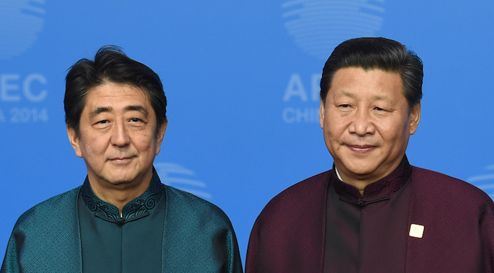 Le Premier ministre japonais, Shinzo Abe, au coté du Président chinois Xi Jinping au sommet l’APEC à Naypytaw en Birmanie – Lundi 10 novembre – © Kim Kyung-Hoon
