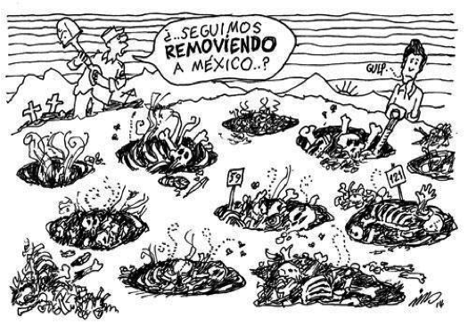 Il est nécessaire de souligner que les recherches et enquêtes entreprises se sont focalisées dès le départ sur la recherche de restes sans envisager la possibilité de retrouver des étudiants vivants. Celles-ci ont permis, le 4 octobre 2014, la découverte de nombreuses fosses aux alentours d’Iguala. Elles représentent la douleur du peuple mexicain et illustrent parfaitement l’état actuel du pays qui, de long en large, n’est plus qu’un vaste cimetière composé de corps inconnus. La première avancée significative de l’enquête a eu lieu le 6 décembre 2014 lorsque les équipes de médecins légistes (autrichiennes) ont identifié les restes de Alexander Mora Venancio, l’un des disparus[15]. Néanmoins, à l’heure actuelle, il n’y a aucune certitude sur les 42 autres disparus d’Ayotzinapa et les corps retrouvés dans ces fameuses fosses n’ont toujours pas été identifiés.