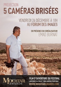 Le Festival débutera par une projection débat autour du film Cinq caméras brisées et de la relation entre cinéma et engagement. Le film étant l’expression d’un double engagement. Celui d’individus aidant l’opération Cinq Caméras pour Gaza qui, pour aider au développement d’un pôle cinéma et grâce aux dons, envoie du matériel audiovisuel au Centre Nawa pour la Culture et l’Art de Gaza, .