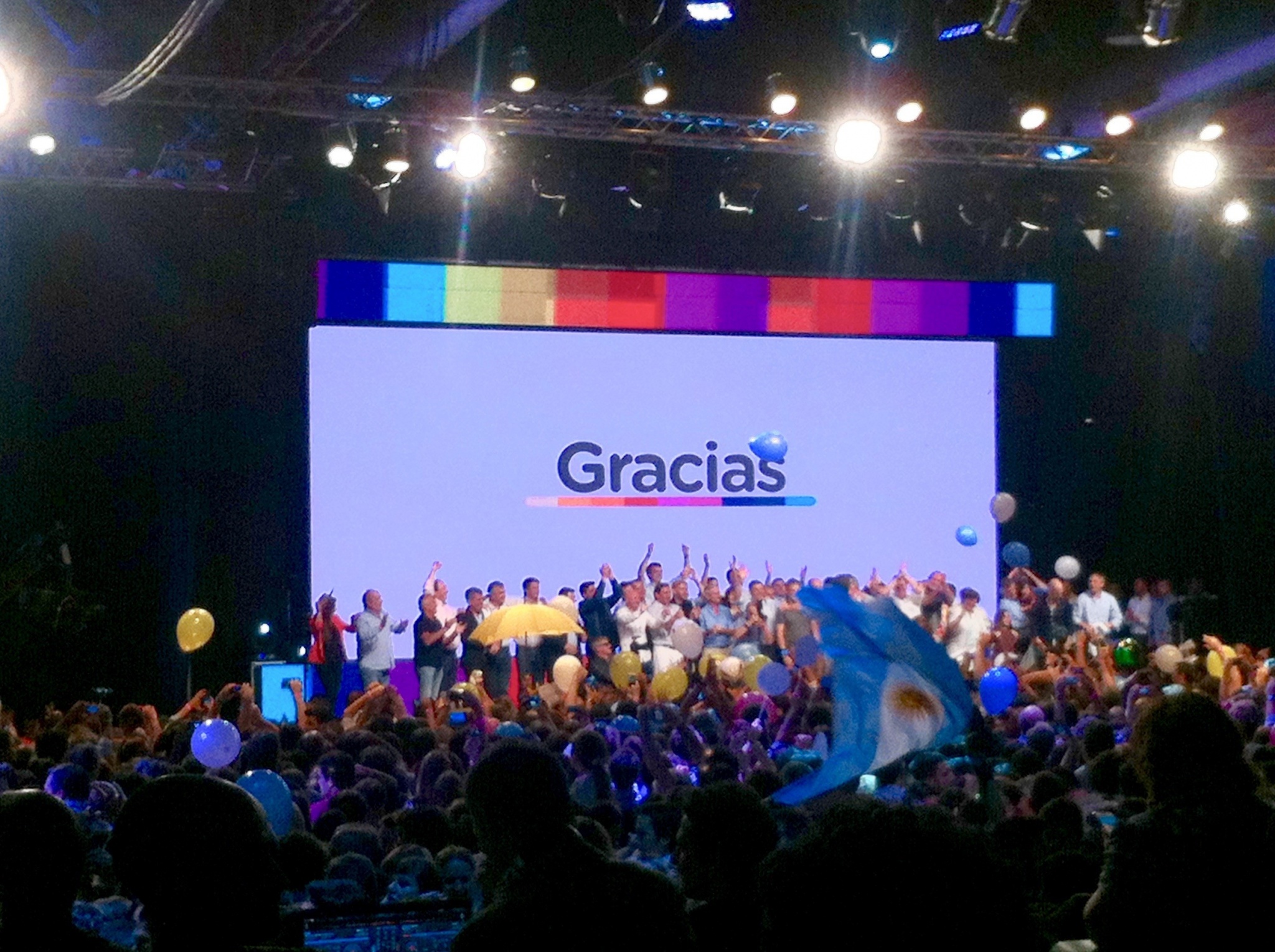 Fête de la victoire au QG de l’Alliance Cambiemos, à l’annonce des résultats du 22 novembre. Macri et son équipe sur l’estrade, drapeaux argentins et balons dans le public. Opinion Internationale vous a fait vivre ce moment historique depuis son compte compte Twitter Opinion_Inter en commentant en direct la soirée électorale dans son intégralité. – Crédit Photo : Justine Perez / Opinion Internationale[/caption]