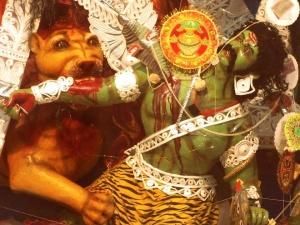 L’histoire de la déesse est bien connue de tous les hindous, et c’est elle qui est retranscrite dans tous les temples construits pour l’occasion, les fameux pandals. Conçue pour combattre, Durga était vouée à détruire le démon Mahishasura, qui issu de l’amour entre un homme et un buffle, transformait les hommes en bête. Par d’intenses prières, il avait obtenu de Lord Shiva de ne pouvoir être battu ni par un homme ni même un dieu. Il tint donc en échec les hommes, les dieux et y compris la trinité suprême, Brahma, Vishnu et Rudra.