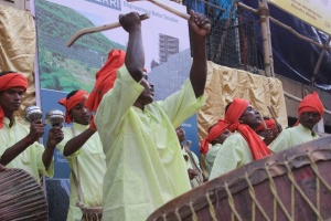 De nombreux musiciens jouent près des pandals des chants pour la déesse, rythmant de façon vibrante la ville. – Crédit : Ipsita Kabiraj