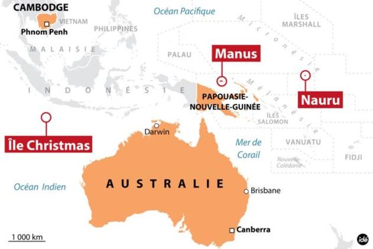 Avant même leur arrivée, les migrants sont interceptés au large des côtes australiennes pour être envoyés en Papouasie ou sur l’île Nauru. Et c’est là qu’ils déposent leur demande d’asile. Pendant le traitement de leurs dossiers, la plupart sont incarcérés dans des centres de rétention répartis sur plusieurs îles mais toujours hors du territoire australien. Quant à ceux qui reçoivent le statut de réfugié, selon les critères de la convention de Genève de 1951, ils ne séjourneront jamais en Australie et pourront être envoyé au Cambodge.