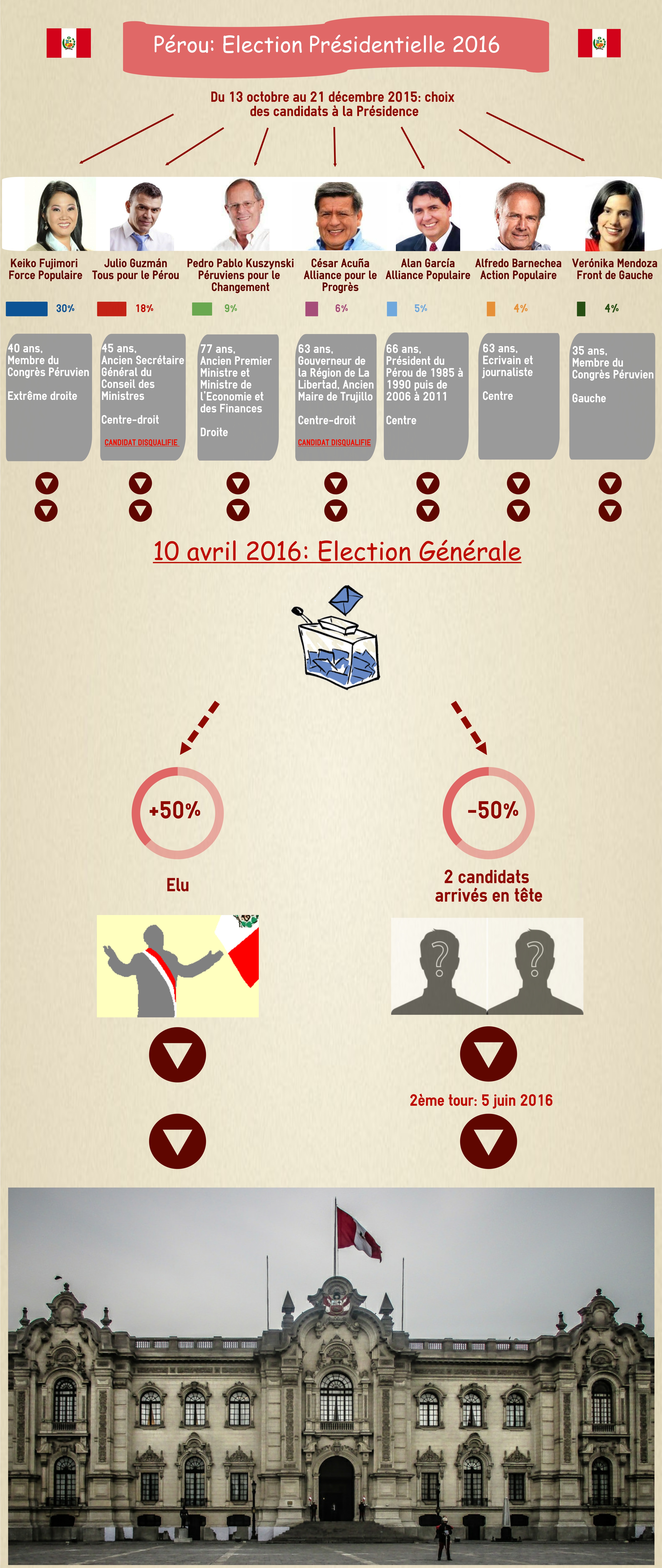 Les dix-neuf candidats à la présidence ont été choisis entre le 13 octobre le 21 décembre 2015 dans le cadre d’élections internes. Les différents sondages, menés jusqu’à début mars, plaçaient Keiko Fujimori, fille de l’ancien président Alberto Fujimori actuellement en prison, en tête des intentions de vote avec 30 %. Elle était suivie par Julio Guzmán (18 %) Pedro Pablo Kuszynski (9 %) et César Acuña (6 %). Or Julio Guzmán et César Acuña viennent d’être disqualifiés par l’Autorité électorale péruvienne pour différentes infractions : le premier est accusé d’avoir commis des irrégularités dans le processus de désignation interne des membres de sa liste, tandis que le second aurait remis de l’argent en espèces à des sympathisants. Cela bouleverse considérablement le tableau de cette élection ; Keiko Fujimori et Pedro Pablo Kuczynski bénéficient évidemment de l’exclusion des deux candidats et gagneraient, selon les estimations, 3 points chacun.