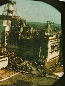 Pris au travers du hublot, ce cliché pointilliste, a échappé par miracle au noircissement total provoqué par le rayonnement très intense émis par le cœur du réacteur en fusion. Là où l’hélicoptère a approché le réacteur décapité, en le contournant, malgré la distance de 300 mètres environ, le rayonnement était si intense qu’en moins d’une heure d’exposition, la dose mortelle de rayonnement pouvait être atteinte.