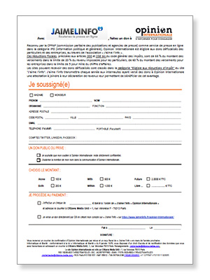 J’aime l’info transmettra chaque année aux internautes ayant versé des dons à Opinion Internationale une attestation à joindre à leur déclaration de revenus leur permettant de bénéficier de cet avantage.