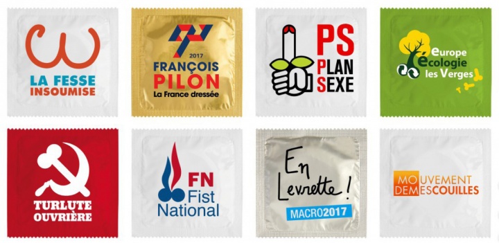 Enfin… seulement 8 « bulletins » dans l’urne avec des préservatifs aux couleurs de Jean-Luc Mélenchon, François Fillon, Benoît Hamon, Europe Ecologie, Lutte Ouvrière, Rassemblement Bleu Marine, Emmanuel Macron et le MoDem (qui n’est pas en lice pour la présidentielle).