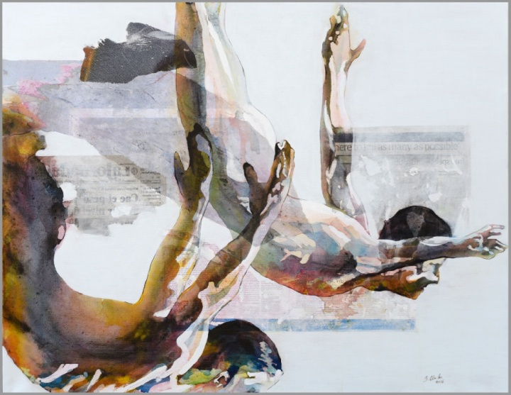 Mais des paysages que l’artiste ne voit pas comme d’autres mortels : issus de sa contemplation des guerres, des luttes et des dominations. La forme se conquiert de haute lutte sur le chaos. Les papiers, les affiches, les journaux sont déchirés, lacérés, transpercés, traversés, collés. C’est le style Bruce Clarke !