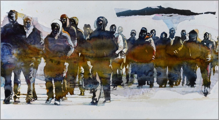 Ses personnages-prédateurs dans les paysages avant le massacre, sont-ils allongés, en suspension dans l’air, en plein vol ? Ses lignes, ses mots, ses visages, sont les fragiles silhouettes d’une humanité qui se redresse.