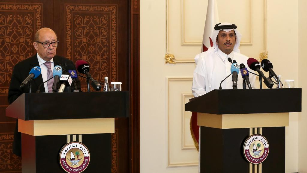 Jean-Yves Le Drian, ministre des Affaires étrangères et aoudon homologue qatarien Mohammed bin Abdulrahman Al Thani, à Doha, ce samedi 15 juillet