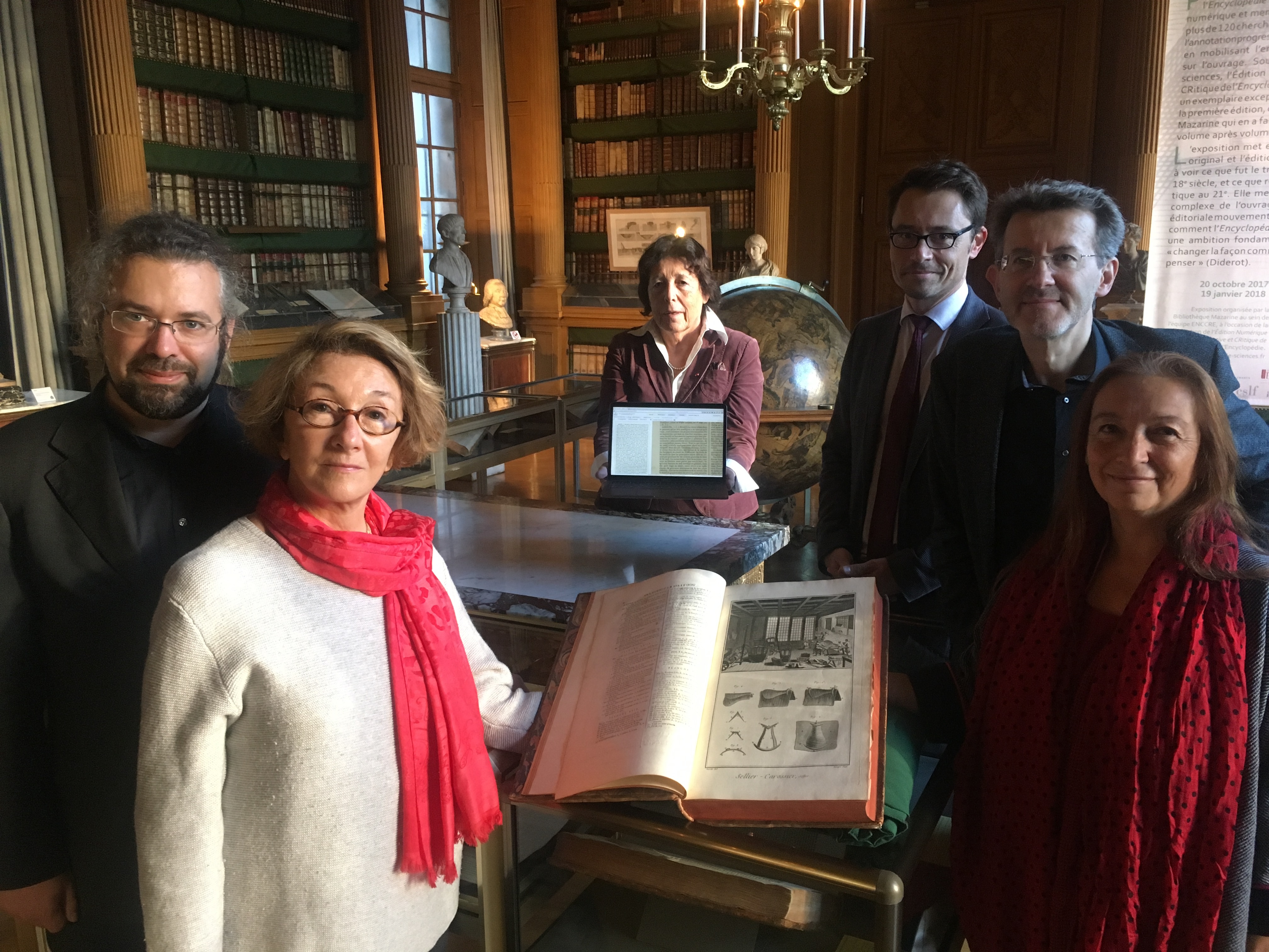 En effet, Catherine Bréchignac, la secrétaire perpétuelle de l’Académie des sciences, entourée d’une équipe de 120 chercheurs coordonnés par Alexandre Guilbaud, Marie Leca-Tsiomis, Irène Passeron et Alain Cernuschi – sur la photo – (sans oublier feu Jean-Pierre Kahane), a eu la bonne idée de piloter cette édition électronique de l’œuvre majeure de l’un de ses illustres prédécesseurs, D’Alembert.