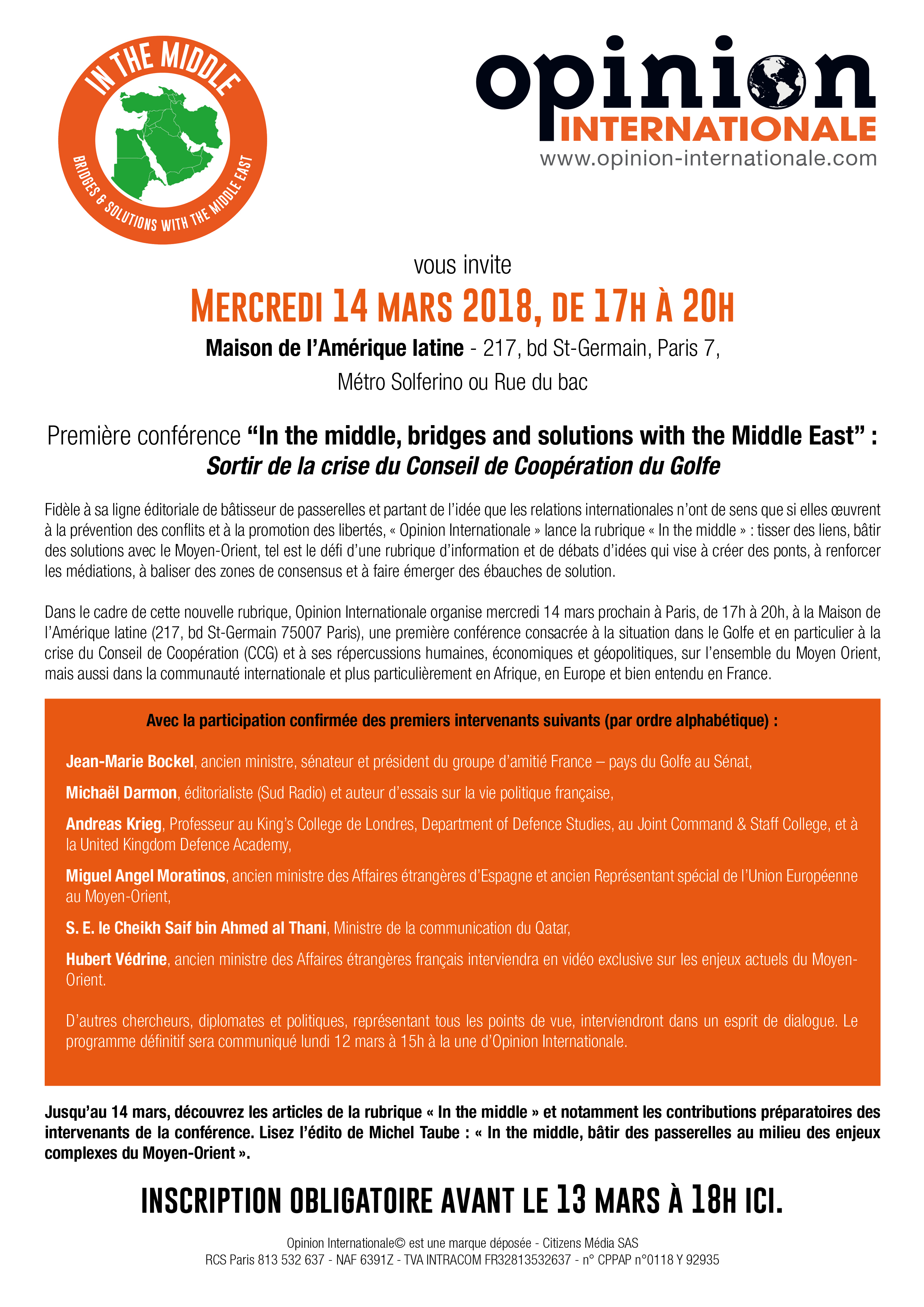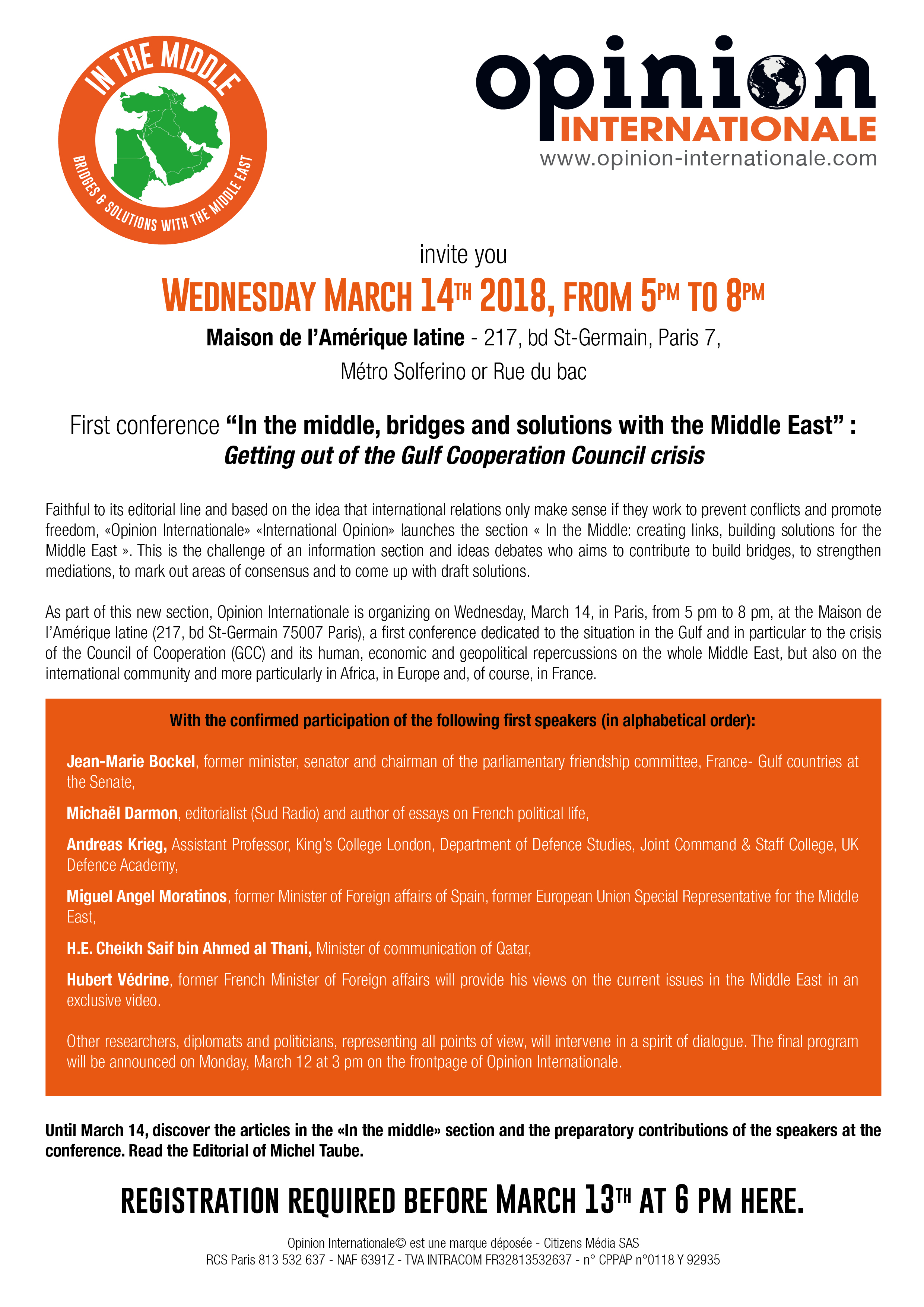 Dans le cadre de cette nouvelle rubrique, Opinion Internationale organise mercredi 14 mars prochain à Paris, de 17h à 20h, à la Maison de l’Amérique latine (217, bd St-Germain 75007 Paris), une première conférence consacrée à la situation dans le Golfe et en particulier à la crise du Conseil de Coopération (CCG) et à ses répercussions humaines, économiques et géopolitiques, sur l’ensemble du Moyen Orient, mais aussi dans la communauté internationale et plus particulièrement en Afrique, en Europe et bien entendu en France.