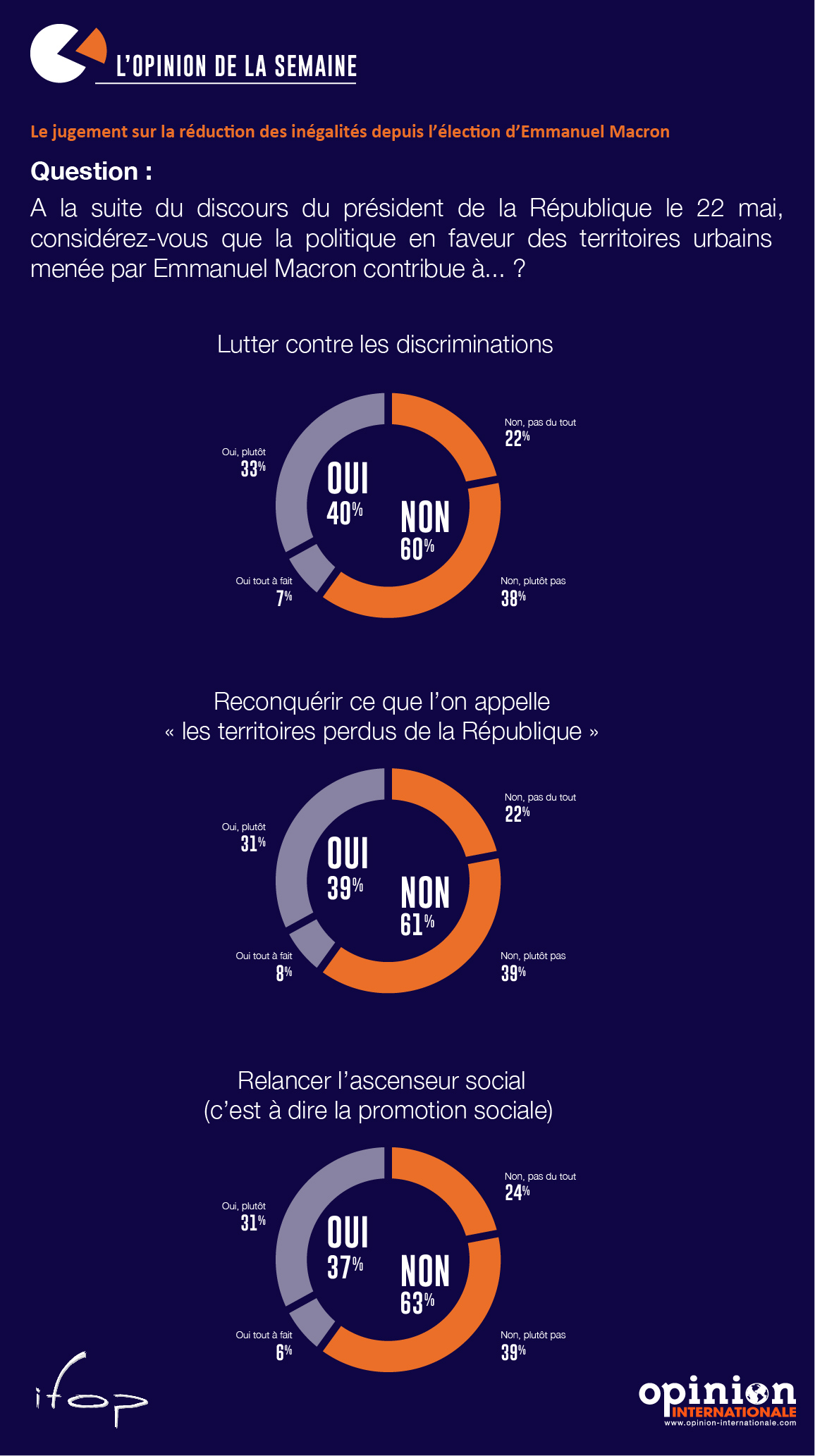 Pour les 1000 Français interrogés par l’IFOP*, le compte n’y est pas. Ils sont plus de 60% à considérer que le discours et les engagements du président de la République ne suffisent pas à relancer l’ascenseur social, à lutter contre les discriminations, à reconquérir les territoires perdus de la République.