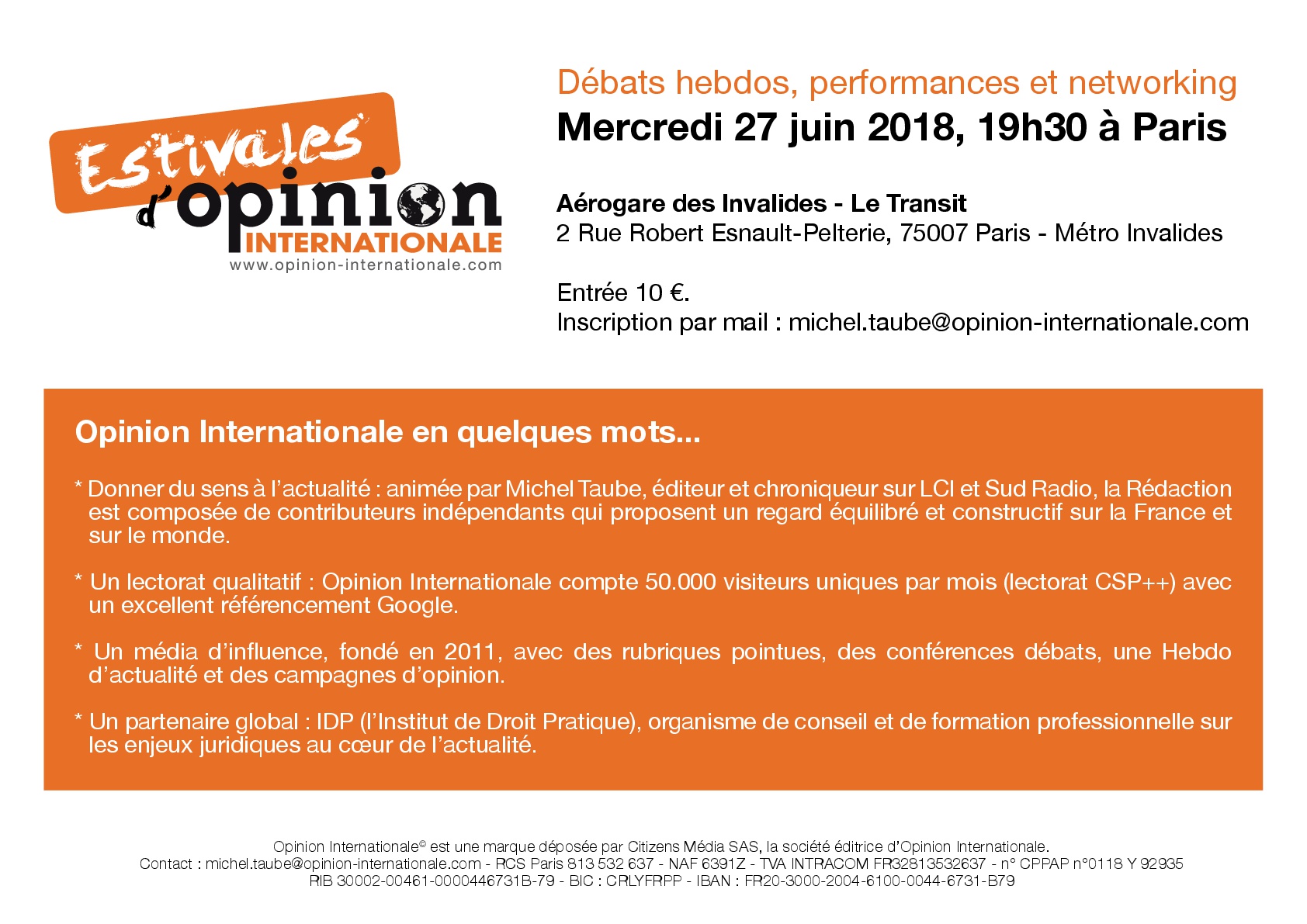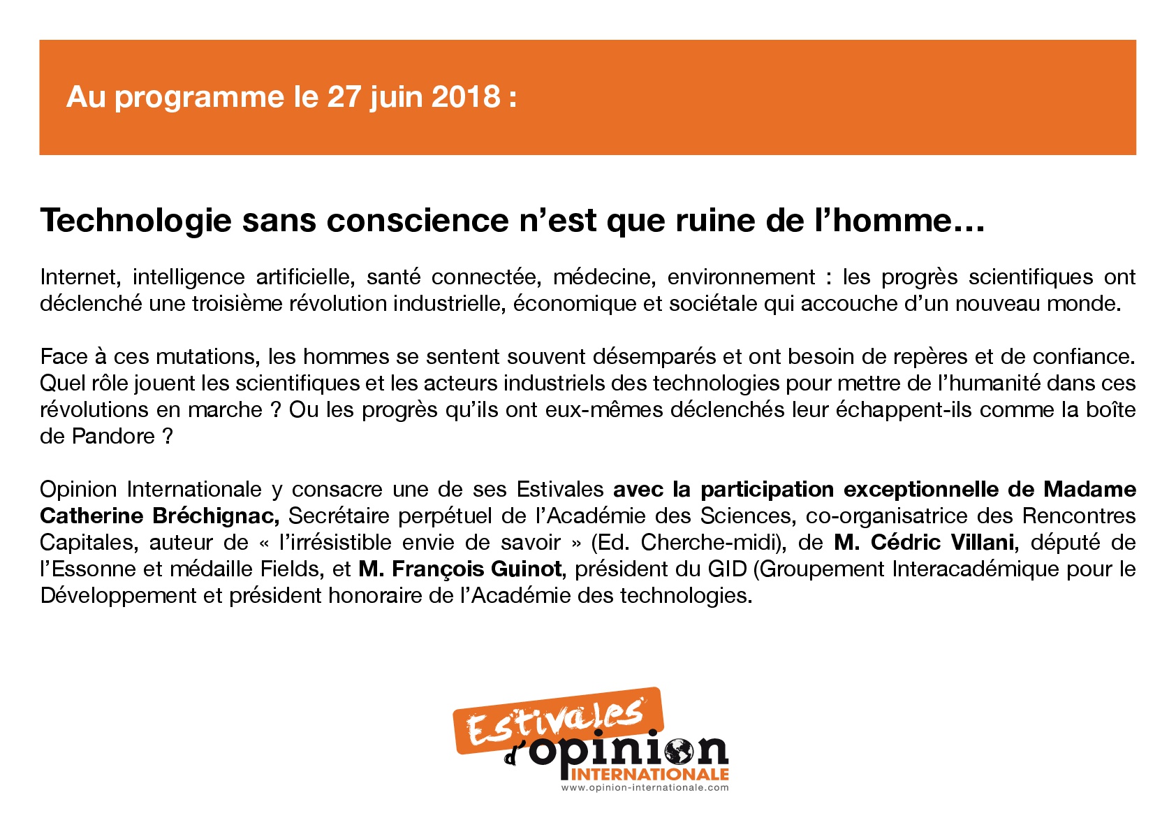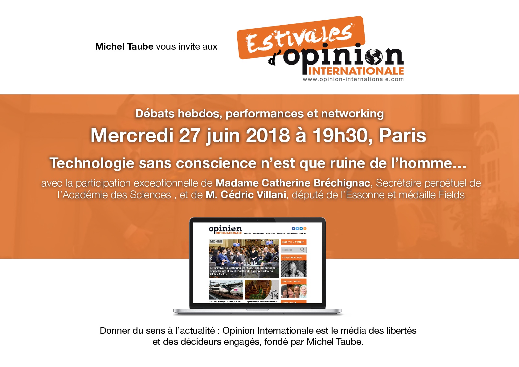Opinion Internationale poursuit ses débats de l’été en consacrant mercredi 27 juin à 19h30 dans l’Aérogare des Invalides à Paris une édition spéciale de ses Estivales au sujet : « Technologie sans conscience n’est que ruine de l’homme ». Inscription ici.