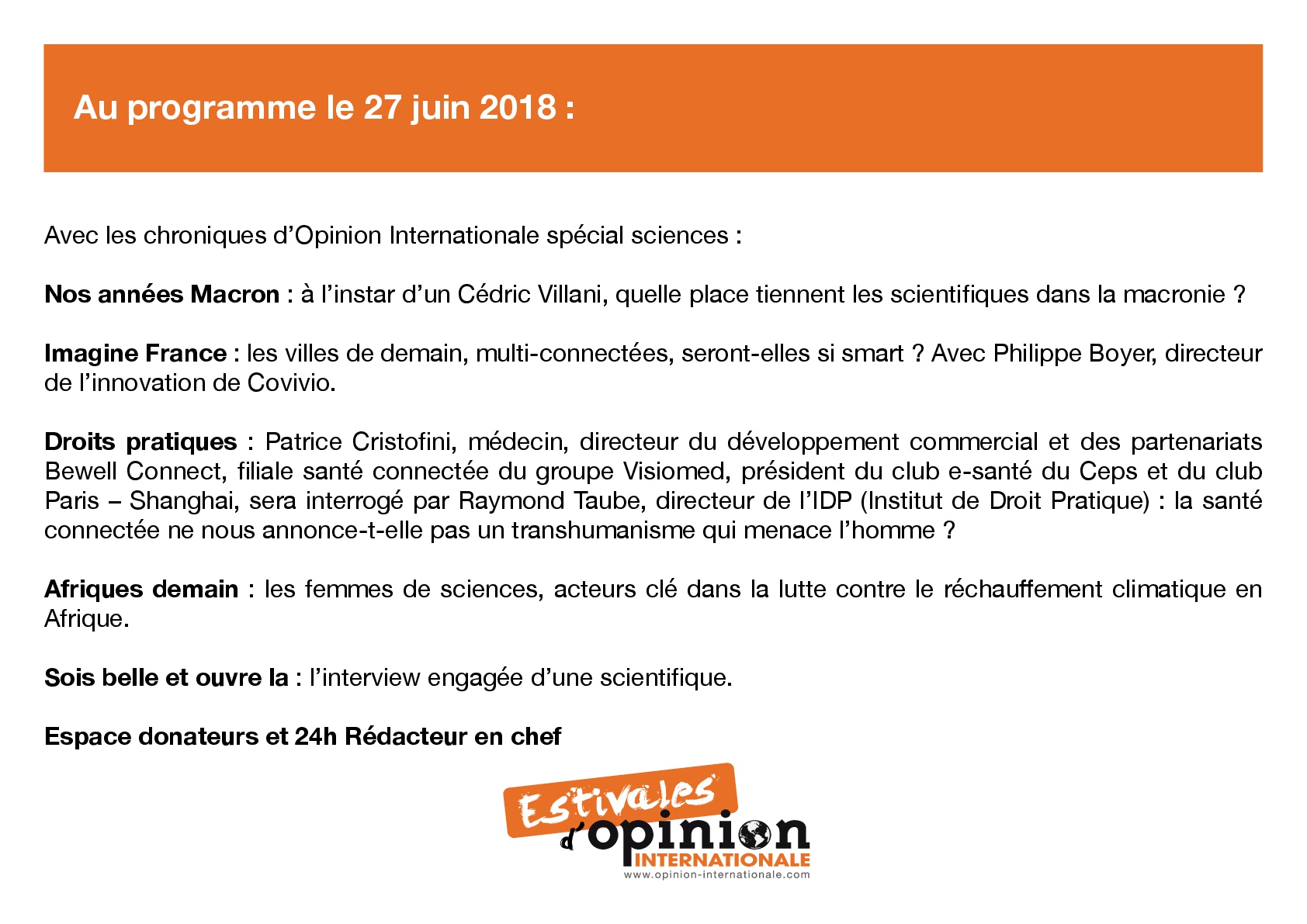 Philippe Boyer, directeur de l’innovation de Covivio nous parlera de smart city, Patrice Cristofini, médecin, directeur des partenariats de Bewell connect, de la santé connectée, et Raymond Taube, directeur de l’IDP (Institut de Droit Pratique) des enjeux juridiques de l’intelligence artificielle. Et enfin, dans le cadre de nos rubriques Afrique demain et Sois belle et ouvre la, nous évoquerons la place des femmes de science dans la lutte contre le réchauffement climatique et une scientifique engagée sera interviewée.