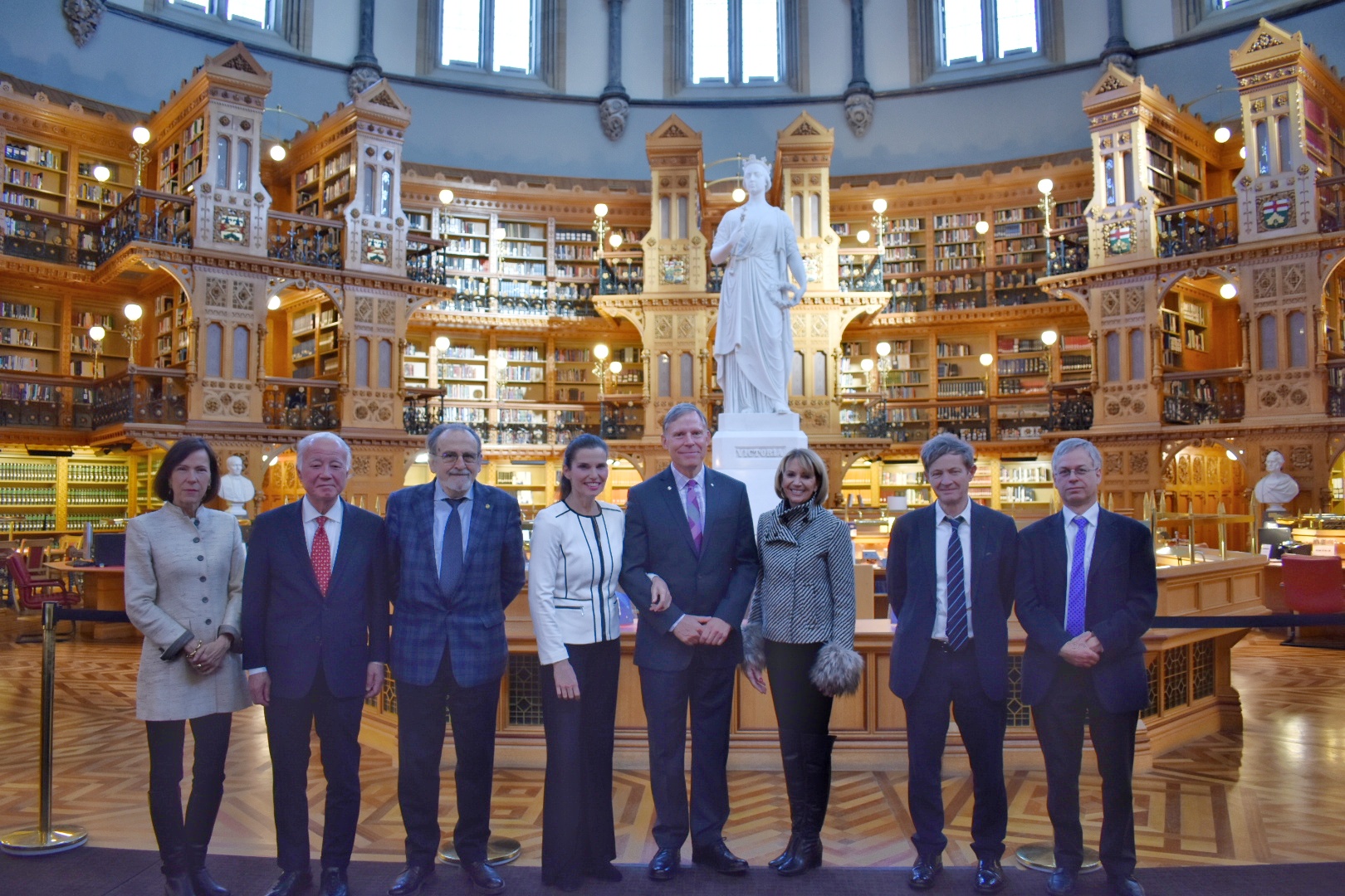 Les présidents d’Académies des sciences à Ottawa en mai 2018. De Gauche à droite : Marina Koch-Krumrei (Allemagne), Kazuhiko Takeuchi (Japon), Giovanni Seminara (Italie), Kirsten Duncan (Canada, Ministre de la science), Chad Gaffield (Canada), Marcia McNutt (Etats-Unis), Sébastien Candel (France), Eric Wolff (Royaume-Uni).
