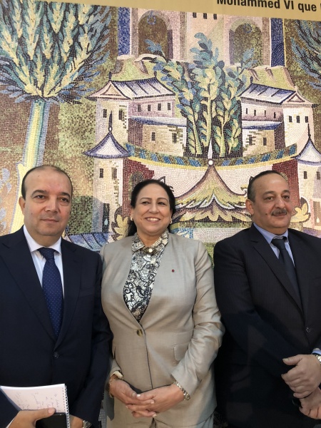 Bahija Simou entourée de Said Zarrou (à gauche) et de Mohamed El Aaraj, ministre de la culture du Maroc devant un fac-similé des mosaïques de la mosquée des omeyyades.
