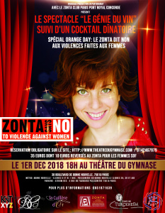 Le 1er décembre 2018, le Zonta Paris Port Royal Concorde vous convie à une soirée spectacle spécial « Orange Day », un Wine woman show « le génie du vin » de la talentueuse comédienne SYLVIE MALYS au théâtre du Gymnase à Paris (métro grands boulevards). Ce spectacle sera suivi d’une présentation des actions de ZONTA envers les femmes SDF d’Ile-de-France et d’un cocktail dînatoire avec une dégustation de vins et bulles de la Cave Turkheim et du Domaine Cassard. Les partenaires du spectacle : Cuillère d’Or et Goût de France (Fête de la Gastronomie).