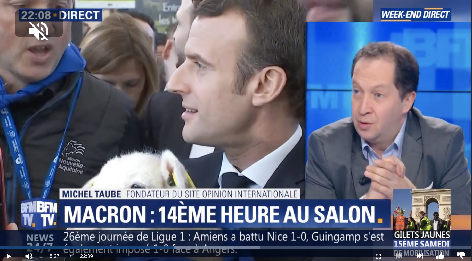 Michel Taube sur BFMTV dimanche 23 février commente la journée d’Emmanuel Macron au salon de l’agriculture et l’Acte XV des gilets jaunes avec Isabelle Florennes, députée Modem des Hauts-de-Seine, Manuel Bompard, numéro 2 de la liste La France Insoumise aux élections européennes, Eddy Fougier, politologue, spécialiste entre autres des mouvements protestataires, de la mondialisation et des questions agricoles :