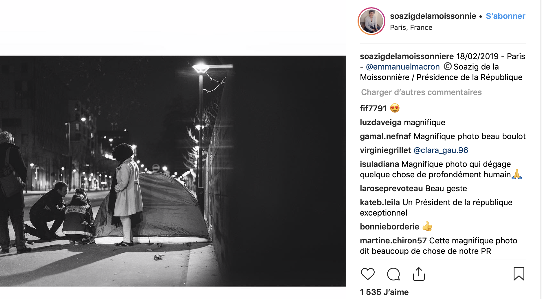 La première est de Soazig de la Moissonniere. Elle est prise lors de la maraude effectuée par Emmanuel Macron auprès de sans domicile fixe la semaine dernière. En toute discrétion sur l’instant mais dans le but (ce qui est normal au fond) de le faire savoir puisque la photo est publiée par la photographe officielle de l’Elysée.